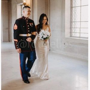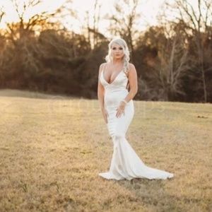 White Deep V Neck Backless Ruched Long Wedding Slip Sheath Dress