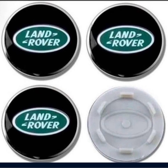 Set of four Land Rover wheel center caps. Features a black and green design.