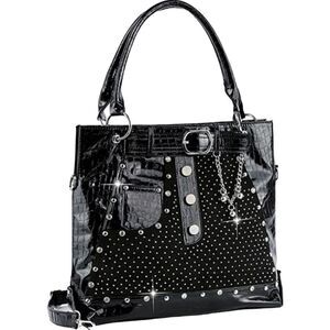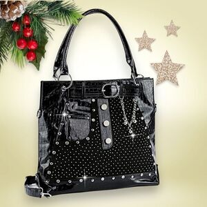 Glam silhouette with a vegan patent leather trim jeans design elevate a versatile jean design tote that is both stylish and sophisticated for your work to weekend fun and essentials. Handbag purse Silver studs