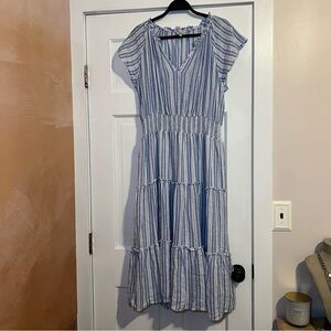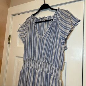 DESCRIPTION: Beautiful, coastal blue and white stripped midi dress. Vertical stripes offering the nautical, beach vibe, while elongating the body. V-neck detailing with minor ruffle detailing around neck. Cap sleeves and elastic cinched waist. Upper portion above waist is single lined, skirt portion is double lined. Lightweight and breezy, making it the perfect summer/vacation staple.
