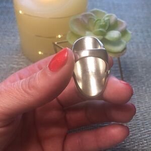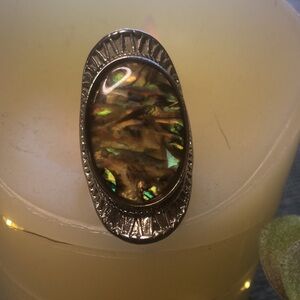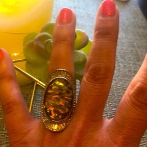 Big and chunky statement piece ring. Silver metal alloy and tortoise shell tiger’s eye stone. Ring model is a size 7 on the ring finger. Bold embellished setting.
