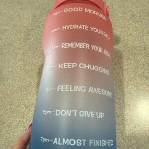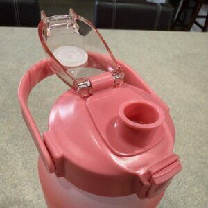 64 ounce water jug with handle to carry, flip open top, and encouraging words. Multi colored.