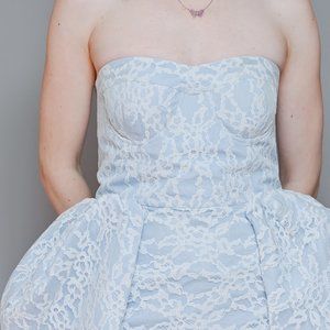 640. CALVIN LUO Blue Lace Overlay Strapless Peplum Dress M