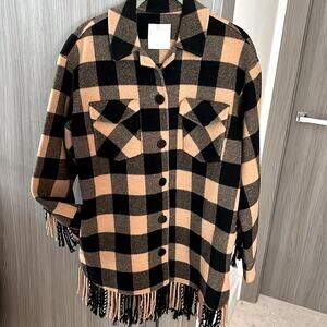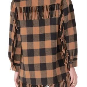 Bold Buffalo checks and fringed trim bring Southwestern-inspired flair to this season’s must-have shirt jacket by Sandro.