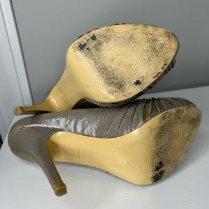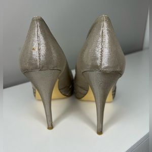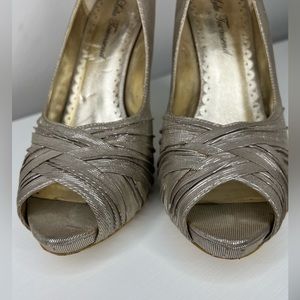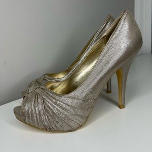 Lulu Townsend metallic gold shimmer peep toe pump heels. Small platform with 4.5” heels. Size 8.5. I wore these once in wedding. They’re a great formal or dressy shoe. The shoes are in good condition but there is one little mark on back of left heel - shown in photo. Let me know if you have any questions! ❤️❤️