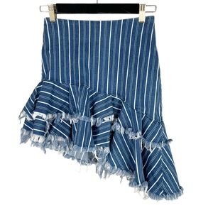 Zara Denim Asymmetrical Ruffle Hem Stripe Skirt in size small. Back zip closure, ruffle asymmetrical hem with fringe hem, stripe denim. Very gently worn. Waist 12.5, length shorter side 15, length longer side 20.5