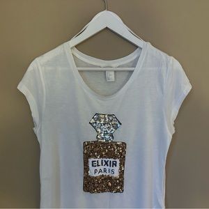 Cute and comfortable H&M teeshirt with perfume bottle print design with sequin detail. Perfect for your spring wardrobe.