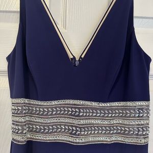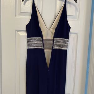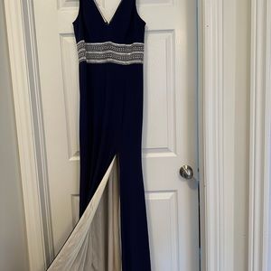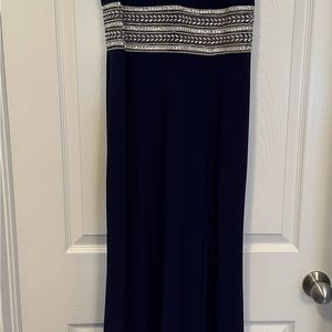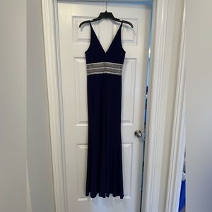 Beautiful eggplant evening gown. Worn once. Smoke-free home. Has small run near bottom hem and a small pull at the top (see photos). Looks like it can be snipped out.