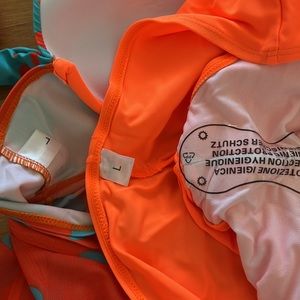 Brand New, Large with bra cups, shorts are neon orange, top is orange w/teal polka dots