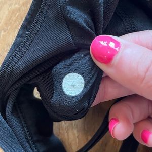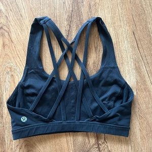 This is a Lululemon Free To Be Serene Bra! The color is black. It’s been worn and washed but still has lots of life left! The material is Luxtreme. It does not include cup pads.