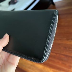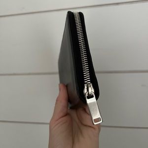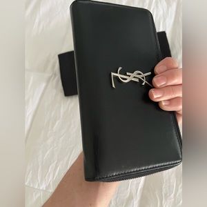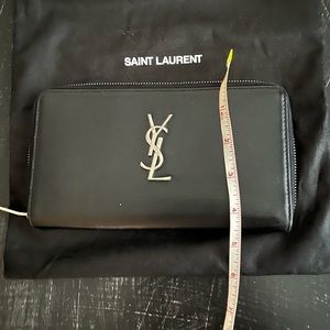 Authentic Preloved YSL continental, zip around wallet/clutch. Beautiful smooth black leather with silver hardware. There are 2 listings for this. Please see both listings because the photos are the best description. (In the last pic I’m pointing to an indention that was made when the zipper closed on the wallet) The other listing has more photos of the outside.