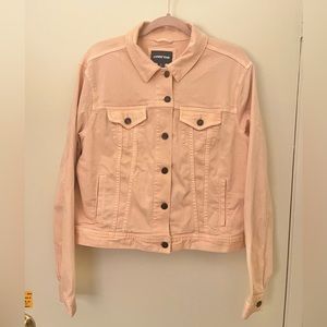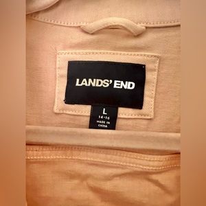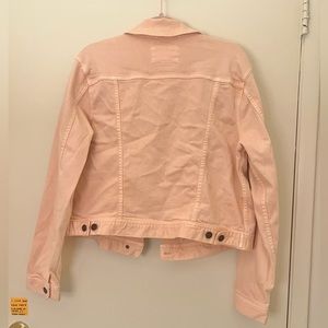 Pale pink / peach jean jacket by Land’s End, in jegging material. Size large but fits oversized. Perfect for springtime outfits. In great condition; no wears, tears, or stains. Comes from a smoke-free and pet-free home.
