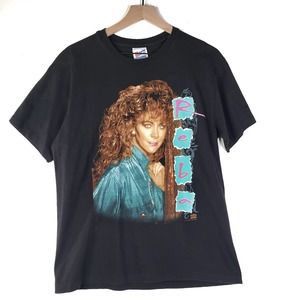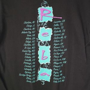 Key features: black cotton short sleeve tee, Reba on the front with big red hair and teal graphics, tour dates on the back, single stitch, hard to read the date, but it's early 90s