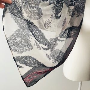 Semi-sheer scarf, rectangular shaped, in black, white and red colours with India style paisley pattern.