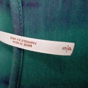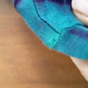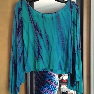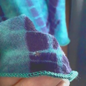 Free People top with beautiful turquoise purple and blue tie dye pattern. Bell sleeves, thin comfy knit material. Excellent condition except for 2 tiny holes, one on the shoulder where the tag was and one on the sleeve (see photos) otherwise like new condition. Pit to pit about 17", length about 19".