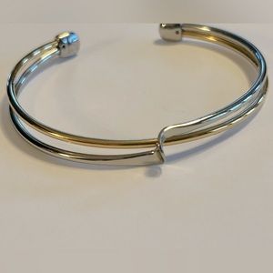 Silver and gold in this beautiful slender cuff bracelet. Measures 7.5 inches but open end makes it adjustable for various wrist sizes. In great condition.