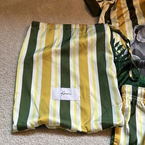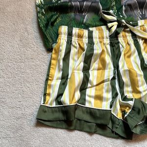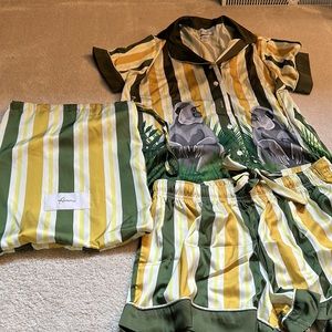 This two-piece pajama set has a soft satin finish, adorned with stripe print and gorilla motif.