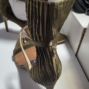 selling a pair of brand new shoes. shoe has an ankle strap and a fan design on the back of the ankle. purchased and never wore them.