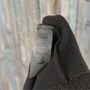 This pullover top from Soft Surroundings features a flowy asymmetric hem in a soft brushed fleece knit. Long sleeves. Olive green color. Jewel neck. Modal & poly. Made in the USA. Boho lagenlook aesthetic