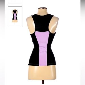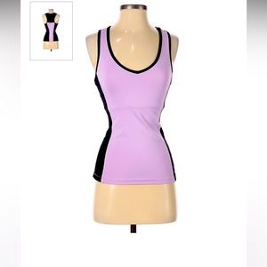 Perfect like new condition; worn once it twice. Very cute and comfortable. V-neck in the front and mesh race back. Has an undertop attached bra for comfort and support. Beautiful color’s combination. Brand is So Sport.com; size is not mentioned but it’s stretchy and can fit both S or M.