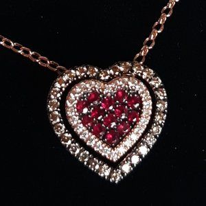 Passion Ruby™ gemstones heart design, framed by an inner row of frosty Vanilla Diamonds® and an outer row of rich Chocolate Diamonds®. 14K Strawberry Gold®, the necklace has a total diamond weight of 3/8 carat.
