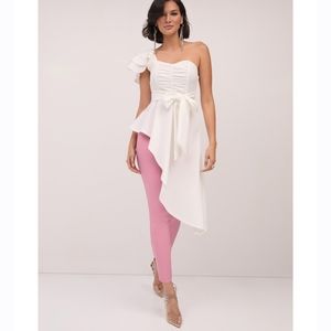 Rouching detail on bodice with flowy long side and ruffle shoulder detail