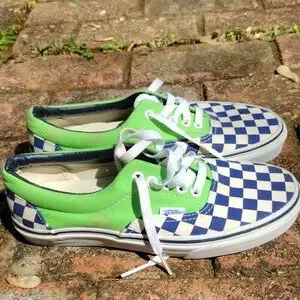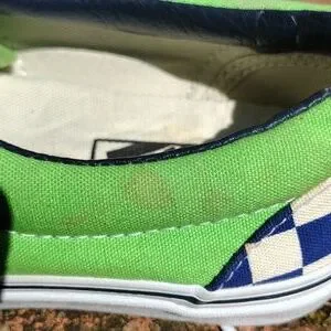 Blue and white checkered with lime green accent color lace up low top Vans off the wall sneakers in size 6 and 1/2 men's 8 women's. in extremely good condition except for a few stains that are light faint on the rim of the ankle on the left foot and one spot on the side of the right foot...there's like four spots on the left foot that I noticed. doesn't look like they've ever actually been worn outside the souls are like perfect but something obviously got spilled on them I'm sure it'll come right out with some Grandma's stain remover.