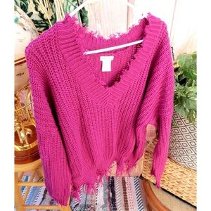 Beautiful magenta hue, distressed hemline, v-neck which allows you to wear on or off shoulder, medium weight and has the perfect slouchy fit. Perfect for cooler spring days! In excellent condition.