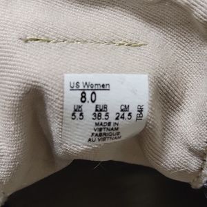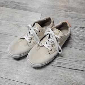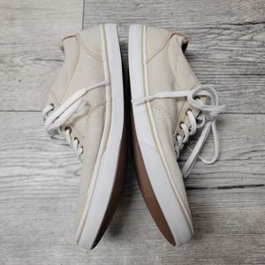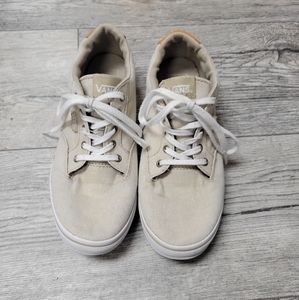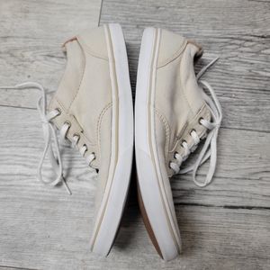 Vans Sz 8 Womens Tan Sneakers. One small mark on left toe box. Lace up. Light beige / tan canvas top and white edging and brown bottom sole. Small leather section at back of heel.