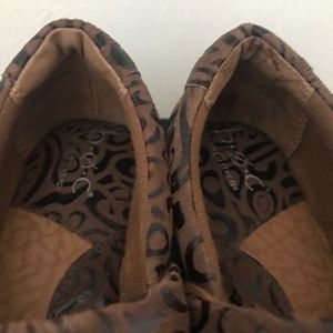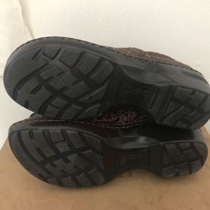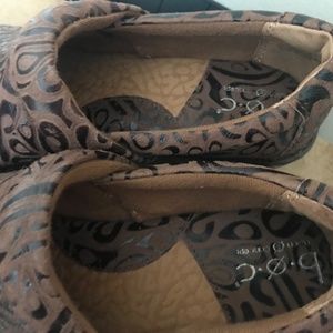 B.O. C. Slide-In Comfort Clog Style from Born Concepts. Genuine Leather/Man-Made rubber grip Soles. Gorgeous brown tooled suede leather design. Brown stitching detail Extra padded cushioned footbed/insoles Round front toes 2" Wedge Heel Size 7.5 M US 38.5 EU In very good used condition. Light wear on bottom of heels in back. Creasing in leather tops and inner heels from normal wear. No holes in lining or stains. Sharpie mark on bottom that blends into dark brown heel. A comfortable, durable shoe that will last many years! This versatile style is both casual and dressy. Box not included.