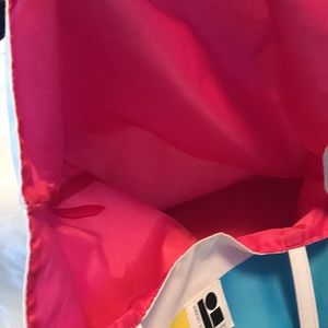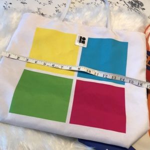 Two Estee Lauder shoulder bags. See measurements in pictures. Lisa Perry white bag with yellow, pink, lime green And teal color blocks on front of bag and pink lining. Harper Bazaar Purpleish blue and orange. Orange handle and lining.Image is on both sides of this bag. Very good condition.