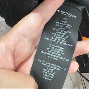 Stamped Coach on both outer and inner button. Embroidered Signature C on the front left breast and on the back is the coach signature stage coach brightly and boldly embroidered not just painted on. Almost like it says “were gay, we’re queer, we’re here to stay”