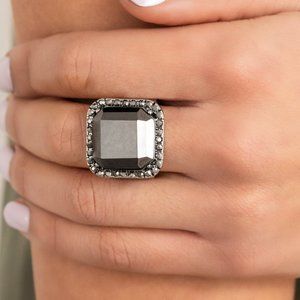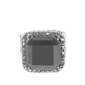 A lavish square hematite gem, encased in a border of dainty hematite rhinestones, makes a head-turning centerpiece as it gleams with an industrial edge atop the finger. Features a stretchy band for a flexible fit.