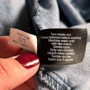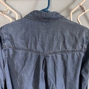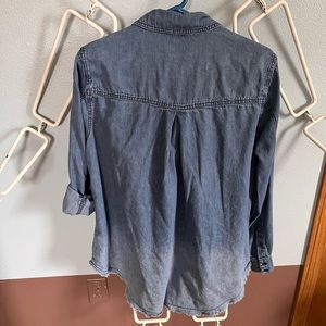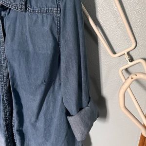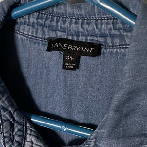 Lane Bryant Denim distressed fade button up shirt size XL. Very gently worn from clean smoke free home. Comfy denim fades at hips and has raw distressed hem.