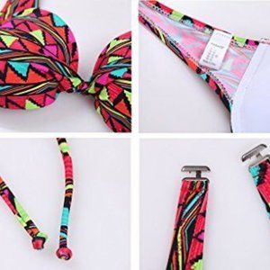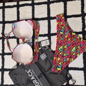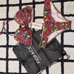 NWT Figrace L Retro Mosaic Triangle Print Bikini Top + Bottom Set + Swim Bag