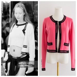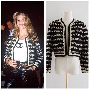 Chanel’s 2015 Fall/Winter collection featured a highly covetable, black and gold silk-cashmere blend cardigan that immediately became one of the most sought-after pieces. Adorned with stunning gold and lucite camellia buttons, this V-neck, quilted pattern sweater cardigan boasts two patch pockets with camellia button closures. The classic color scheme and iconic design make this sweater a timeless addition to any wardrobe. This versatile piece is perfect for elevating a casual outfit or adding a touch of chic to any ensemble. Excellent condition, no visible flaws or remarkable signs of wear. Size FR36, measurements: shoulder 14", bust 34", waist 30", length 22", sleeve 21".