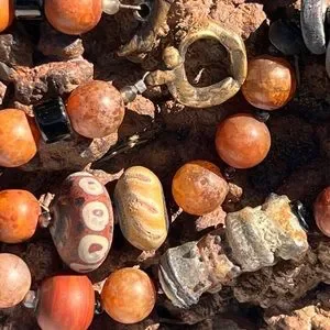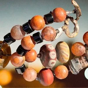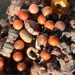 This necklace includes handmade Ovington lampwork, other artisan handmade lampwork beads, a fossil pendant, black glass barrels, Miyuki beads, metallic seed beads, snakeskin agate (a form of chalcedony) and bronze toggle clasp.