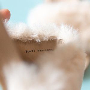 Features: Bright creamy white slip on style slide sandals with faux fur fluffy toe strap.