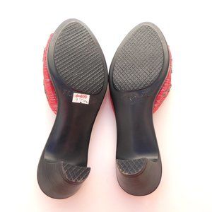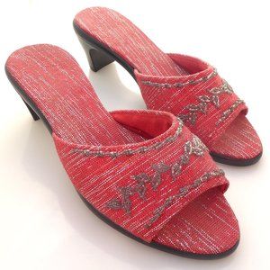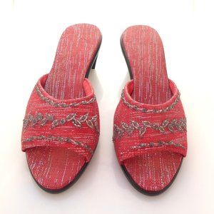 Red and silver metallic fabric beaded mid heel mules size 7.5