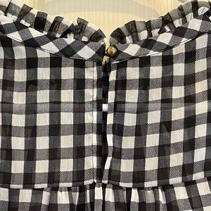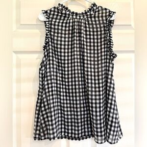 Sheer fabric, sleeveless with ruffle design, ruffles continue around the high neck. Back has gold color button and teardrop opening. Black and white checkered color and pattern.