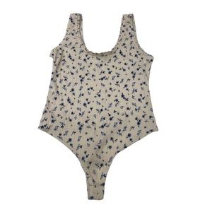 This cream tank style bodysuit has blue flowers throughout. Snap closure at bottom. Cotton/polyester