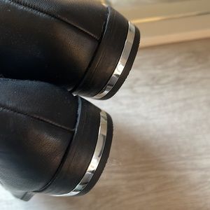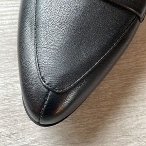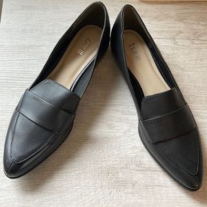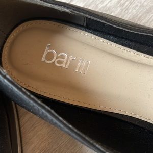 These are a pair of Bar III black leather loafers. These have a pointed toe and metal detailing on the heels. These are really smart and would make a great addition to your professional or casual wardrobe. Shoes are new in box and never worn.