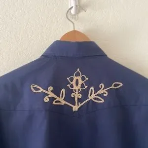 Chemise by Kennington embroidered rodeo button down size medium. Navy blue embroidered cream and opal buttons.