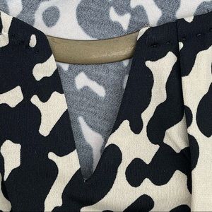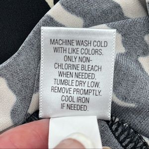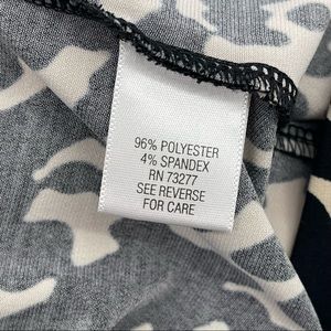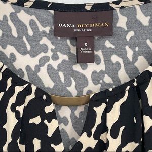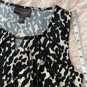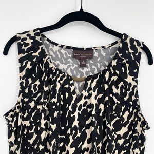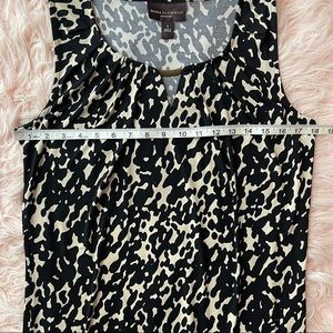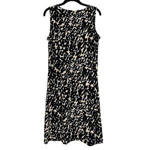 Black and Tan print on the stylish yet effortless shift dress. Features small v cutout at neckline with bronze tone accent. Straight relaxed fit, sleeveless, soft stretch fabric.