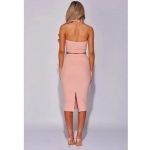 Nude Pink Sleeveless Halter Neck Keyhole Open Back Crop Top and High Waist Midi Skirt Two Piece Set