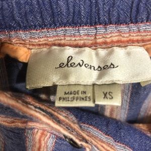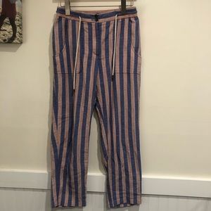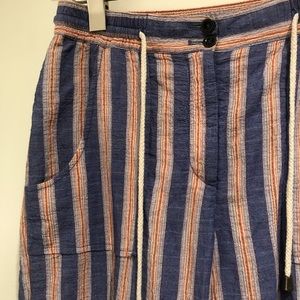 Anthropologie brand, Elevenses Beach roll up pants. Size xs. Gently worn with no stains or holes. Striped pants with button and drawstring closure, pockets in front and back. Loose fitting for a casual breezy look. Perfect for vacation or everyday wear!