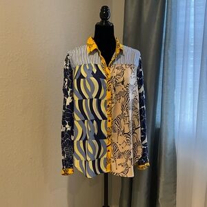 Cynthia Rowley square neck sleeveless linen top. Simple leaf patter of cinnamon, white, French blue and salmon.