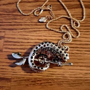 Special Features: Adorable IGUANA perched on a branch, super sparkle in pink, silver, and black, Goldtone chain, lobster claw clasp, extension, Heart charm at nape
