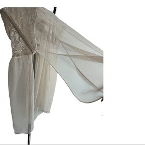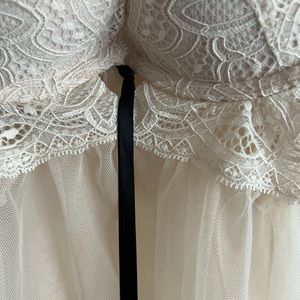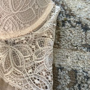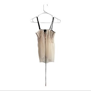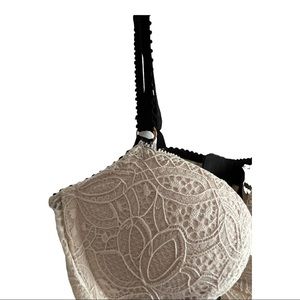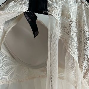 Great condition, looks practically brand new. This is such a sexy top but still offers some coverage with padded cups. Does have a removable tassel in the middle for whatever your taste is. It’s like a very light pink color with black lace and straps. Size is 34B. Could be great for a bachelorette party or wedding night lingerie