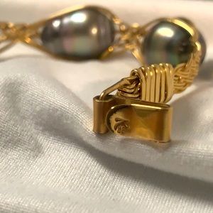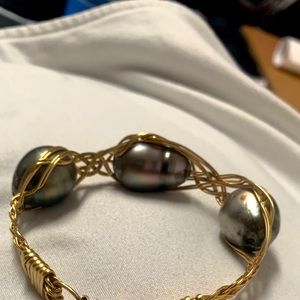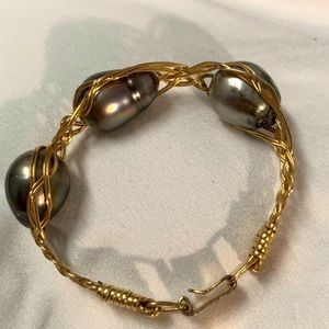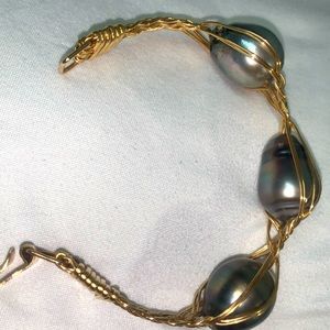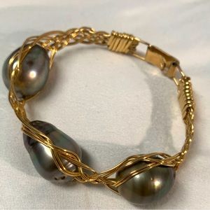 This beautiful bracelet is made with 14K Gold Filled Wire and 3 large Tahitian pearls.